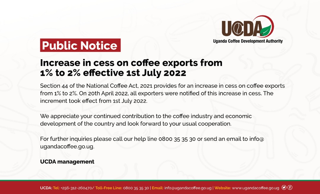 Public Notice: Increase in CESS on Coffee Exports from 1% to 2% effective 1st July 2022